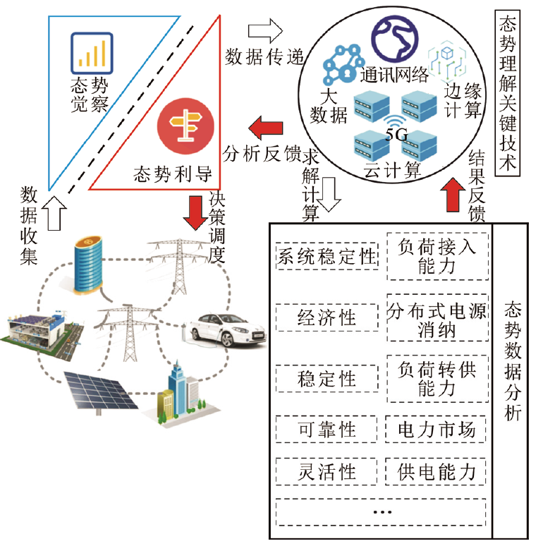 態(tài)勢理解是數(shù)據(jù)分析階段,深入理解與挖掘在態(tài)勢覺察階段中收集到的數(shù)據(jù),并從系統(tǒng)穩(wěn)定性、經(jīng)濟(jì)性、負(fù)載轉(zhuǎn)供能力、可靠性、靈活性、供電能力、負(fù)荷接入能力和分布式發(fā)電消納能力等方面分析智能配電網(wǎng)的運(yùn)行態(tài)勢,其架構(gòu)如下圖所示。態(tài)勢理解主要關(guān)鍵技術(shù)包括:不確定性潮流計算技術(shù)、混合狀態(tài)估計技術(shù)、配網(wǎng)彈性分析與自愈控制技術(shù)、配網(wǎng)可靠性與靈活性分析技術(shù)、配網(wǎng)協(xié)同調(diào)度技術(shù)、配網(wǎng)故障定位技術(shù)、電力市場技術(shù)、虛擬電廠技術(shù)、邊緣計算技術(shù)等。