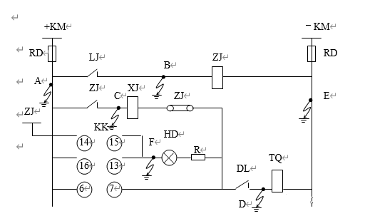 如圖所示,當(dāng)直流接地發(fā)生在A、B兩點(diǎn)時(shí),將電流繼電器觸點(diǎn)短接,而將出口中間繼電器ZJ啟動(dòng),ZJ觸點(diǎn)閉合而跳閘。A、C兩點(diǎn)接地時(shí)短接ZJ觸點(diǎn)而跳閘。在A、D兩點(diǎn),D、F兩點(diǎn)兩點(diǎn)接地同樣都能造成斷路器跳閘。