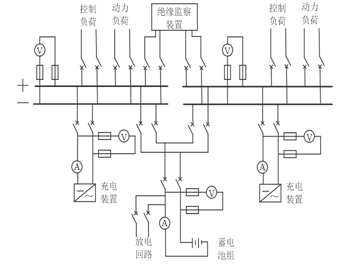 單組蓄電池和充電裝置接到同一母線上,母線上只裝設(shè)一套絕緣監(jiān)察裝置和電壓表,接線簡單,可靠性低。在110kV及以下變電站有采用。