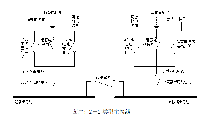 高頻開關(guān)電源,現(xiàn)在廣泛使用,220kV及以上變電站或重要的110kV變電站直流系統(tǒng),也常采用如下接線方式(簡稱2+2方式)