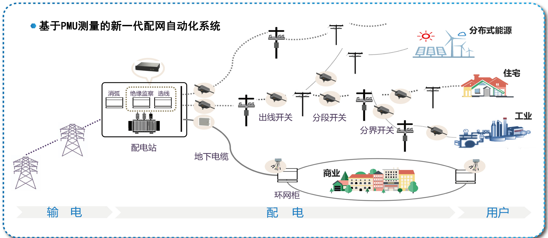 基于PMU測量的新一代配網(wǎng)自動化系統(tǒng)集故障診斷、狀態(tài)估計、配網(wǎng)協(xié)調(diào)控制、配網(wǎng)高級應用等功能與一體,擁有大數(shù)據(jù)分析軟件系統(tǒng)、PMU型配電開關成套設備、PMU型配電終端、配電智能監(jiān)測裝置等全線產(chǎn)品。